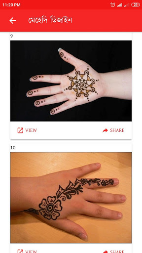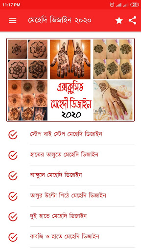 Aplikasi luar talian yang dibuat dengan seni reka bentuk mehendi baru yang terbaik pada tahun 2020 akan membantu menghiasi kuning dan pengantin untuk majlis perkahwinan dan memberikan dua pakaian khas Eid termasuk Eid-ul-Fitr, Eid-ul-Azha. Aplikasi ini diperkaya dengan reka bentuk telapak tangan dan gambar reka bentuk mehedi parti moden India dan Pakistan dengan dua tangan.