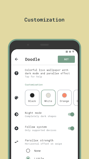 Doodle adalah aplikasi Android sumber terbuka yang menyediakan wallpaper hidup berwarna-warni dengan mod gelap auto dan kesan paralaks yang cekap.Wallpaper didasarkan pada Wallpaper Doodle Live of the Google Pixel 4.