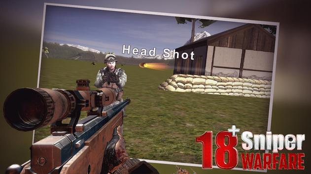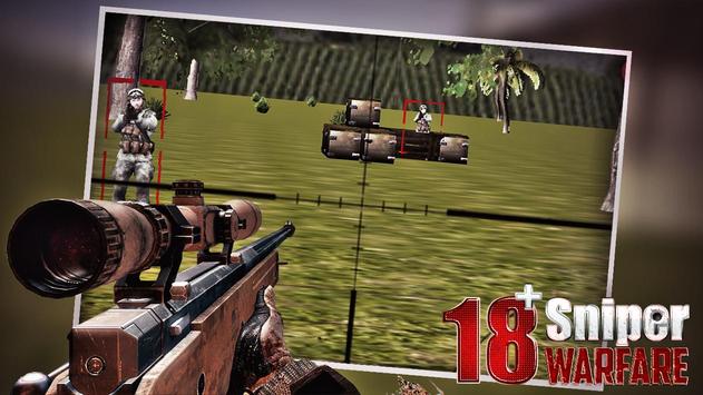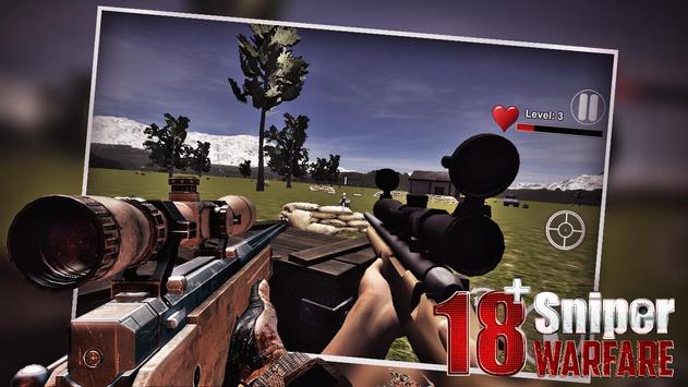 18 Sniper Warfare is a shooting game in which you are assigned tasks to assassinate the enemy targets with your sniper ammunition and bullets. Enter the kill zone in war where all you have to do is test your sniper shooting skills by aiming the enemy army soldiers in a stealth mode. Like other popular games this sniper hunting game has levels where you have to kill the enemies in different sceneries. Your army soldiers need you and shoot the enemies from sniper's nest. To take the perfect head shot you have to hold your breath and take the aim for the headshot.