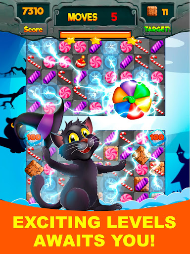 Adakah anda peduli dengan misteri Halloween yang mistik? Muat turun "Candy 3: Sweet Mystery 2" pada peranti anda dan nikmati permainan yang menyeronokkan. Lalui tahap demi tahap. Kagumi keindahan dunia sihir bersama dengan kucing yang ceria, penyihir pembantu. Dia akan mendapat mata maksimum dan mengumpulkan bonus. Jangan berputus asa dengan teman baru syarikat.