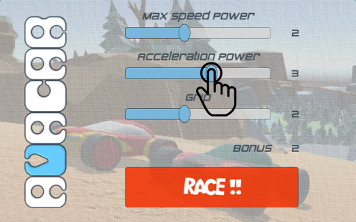 At the beginning of each race you’ll be able to calibrate three key parameters that will determine your car behavior: Max speed, Acceleration and Grip. Enjooy in finding the best compromise