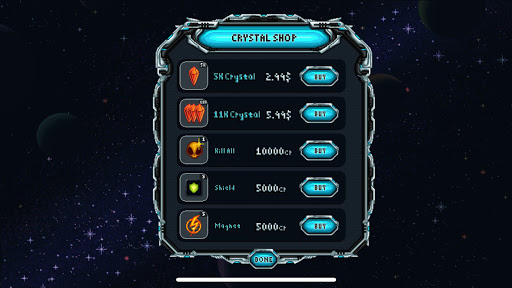Put an end to the Alien Forces. Collect Crystals to buy special items as well as stronger space ship.