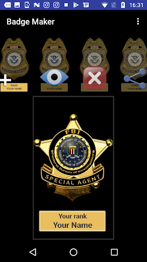 Swipe app screens to choose one of already made badges of existing, or non existing police or military forces, services and agencies all over the world. Show your badge and start your prank.
