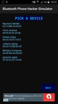 "Bluetooth Phone Hacker Simulator" searches and scans for nearby Bluetooth devices and displays them to you in a list.