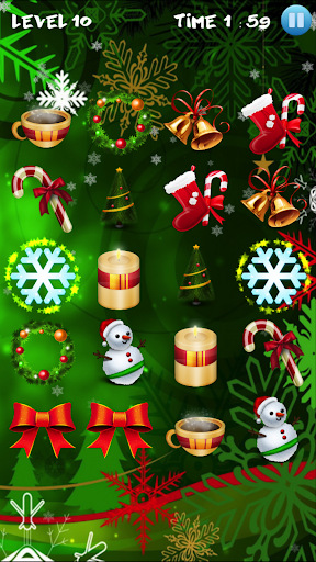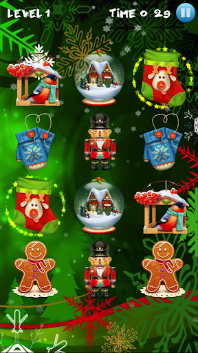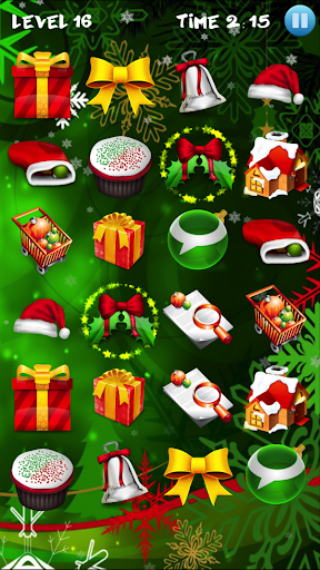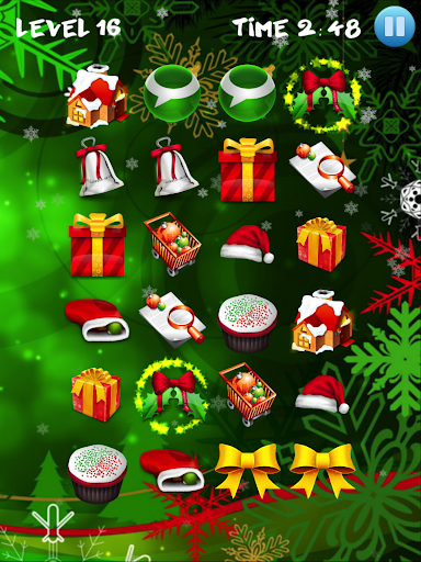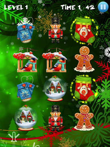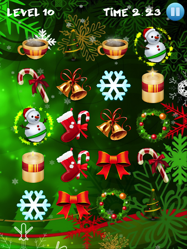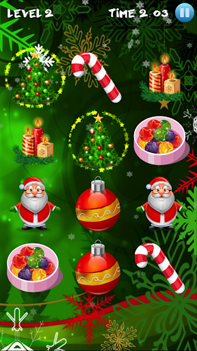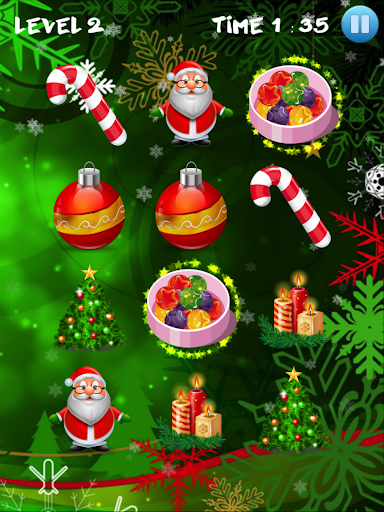 Matlamat anda adalah untuk mencari gambar yang sama di grid. Padankan gambar dengan Santa Claus, loceng, pokok natal, bola berwarna, rusa, bintang terang, kue dan kek lazat, gula-gula, lilin, hadiah yang dibungkus dan kaus kaki Krismas.
