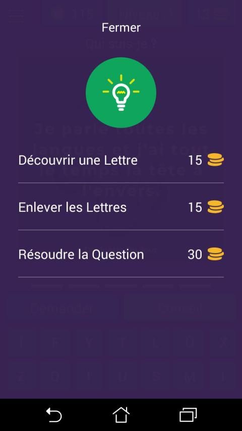 Parfois on vous donne des indices et parfois vous devez utiliser les pièces que vous collectez en devinant pour découvrir la première lettre ou pour supprimer des lettres incorrectes, utilisez vos pièces sagement avec ces options d'aide ou vous pouvez gratuitement partager l'énigme ou la devinette avec vos amis pour obtenir de l'aide !