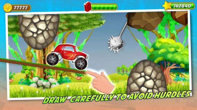 "Draw road race" is in your hands, Be aware while drawing the road as you can draw unlimited road in one go but you must have to pick up your finger and draw road again to avoid tricky obstacles on your way. Everything counts when the fate is out and fuel is going low too, don’t forget to draw road, and let the old monster in this rainy, jungle and hill climbing environment. Collect the star coins as they are not just there for spinning but for unlocking the amazing draw road environments and old but classic monster cars and vans.