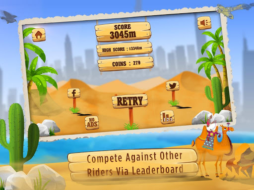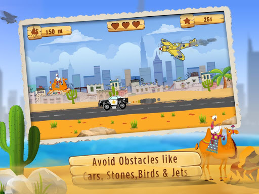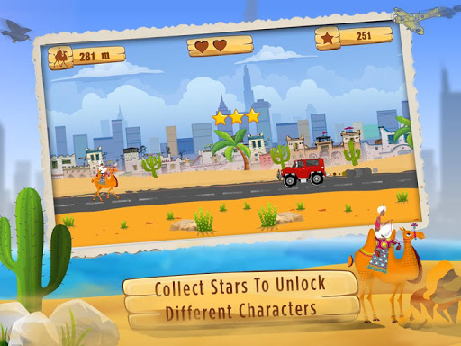 Dubai Camel Rider adalah permainan arked yang penuh aksi.Pilih penunggang kegemaran anda & perjalanan melintasi pemandangan indah UAE, dengan latar belakang Burj Khalifa yang terkenal.Melintas lalu lintas seperti DXB Police, 4x4 Racing Cars & Fighter Jets.Bertahan dari ribut pasir & skor lebih tinggi dengan bantuan kekuatan yang hebat.Sudah tiba masanya untuk beberapa gundukan di Dubai!