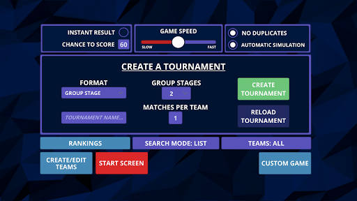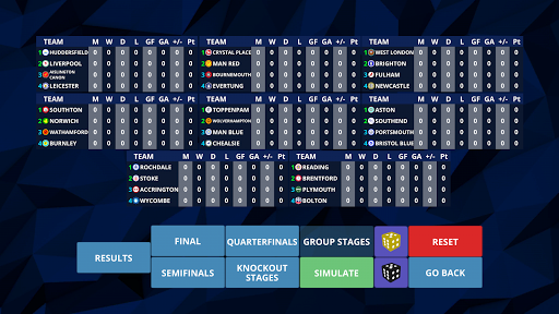 Anda juga boleh meramalkan kumpulan / liga dengansama ada pasukan yang agak baik atau pasukan yang benar-benar rawak daripada 68. Anda juga boleh mengedit setiap kumpulan dan pasukan secara individu.