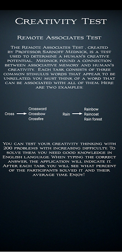 Creativity Test is a fun and interesting word association game. It is based on the Remote Associates Test, which is a method to test a human's creative thinking.