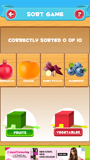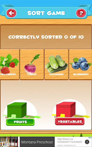 3. Permainan jenis di mana pengguna akan menjatuhkan buah-buahan dan sayur-sayuran di dalam kotak masing-masing.
