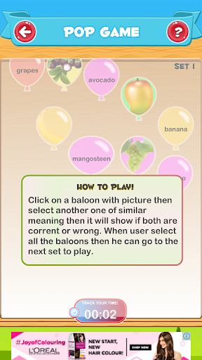 4. Permainan pop belon di mana kanak-kanak akan memilih dua belon yang mempunyai nama dan lain-lain yang mempunyai gambar buah atau sayuran.