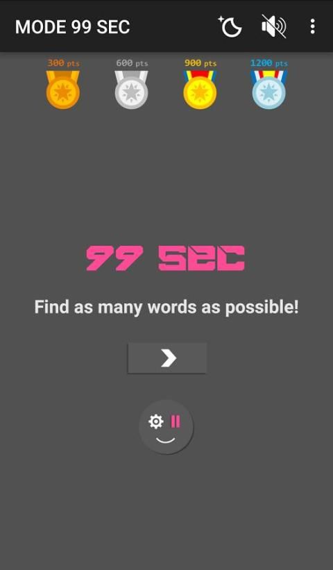 99 seconds to find as many words as possible. Each correct answer gives you 5 more seconds, plus the use of bonus time.