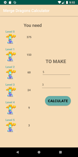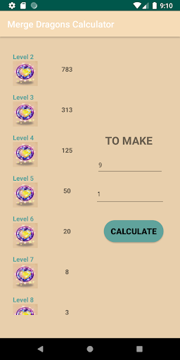 Calculator that tells you how many objects, like dragon homes, midas trees and dragons trees you have to merge to get the level you need. Contact us if you have any suggestions about app improvements, and enjoy your time in the great game Merge Dragons!