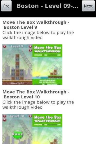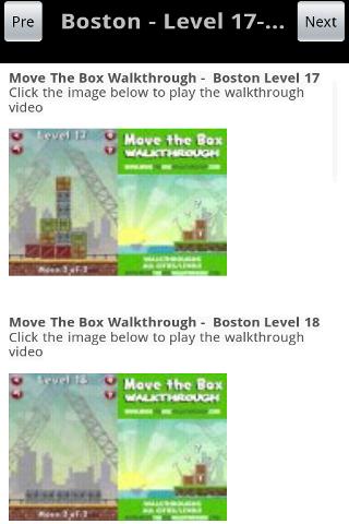 Move the Box guide This app is completely FREE. It is the walkthough for the hottest game in Android, Move the Box. NO inapp purchase needed.Move the Box Solution Guide brings you the VIDEO solutions to ALL LEVELS in Boston, Osaka and Hamburg Following the video guide, we ensure you can walkthrough all the zones.Remember In Move the Box, sometimes it may have more than one solution Looking from a different perspective can also help you solving by yourself each riddle.As soon as you need help to play Move the Box, we will be happy to assist you solve the riddle by using our different levels walkthrough.Keyword Move the Box Walkthrough,Move the Box Guide, Move the Box CheatThis guide is an unofficial version and is not endorsed by or affiliated with the creator of this game or its licensors. This application complies with the US Copyright law guidelines for fair use. All characters, their names places, and other aspects of the video game described within this application are trademarked by their respective owners. This application does not copy any portion of the game, nor does it contain screenshots of the game, only original text descriptions. If you feel there a direct copyright or trademark violation that does not follow within the fair use guidelines, please contact us directly to discuss.