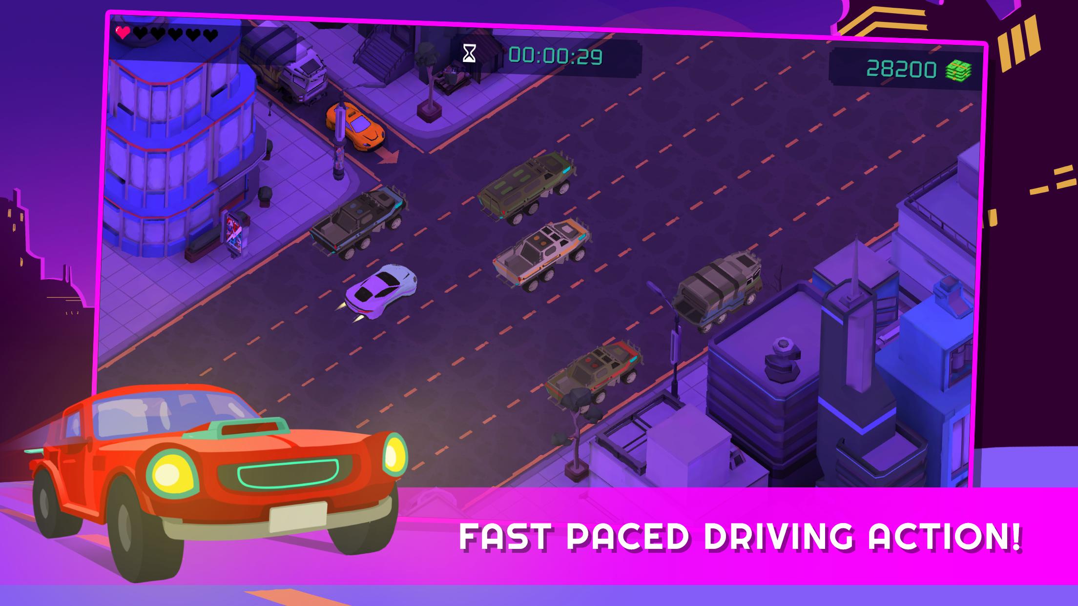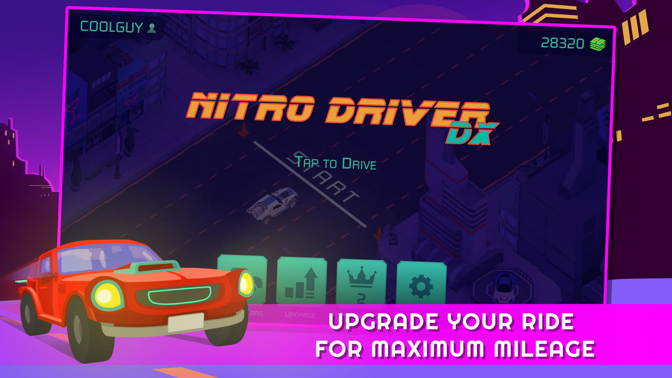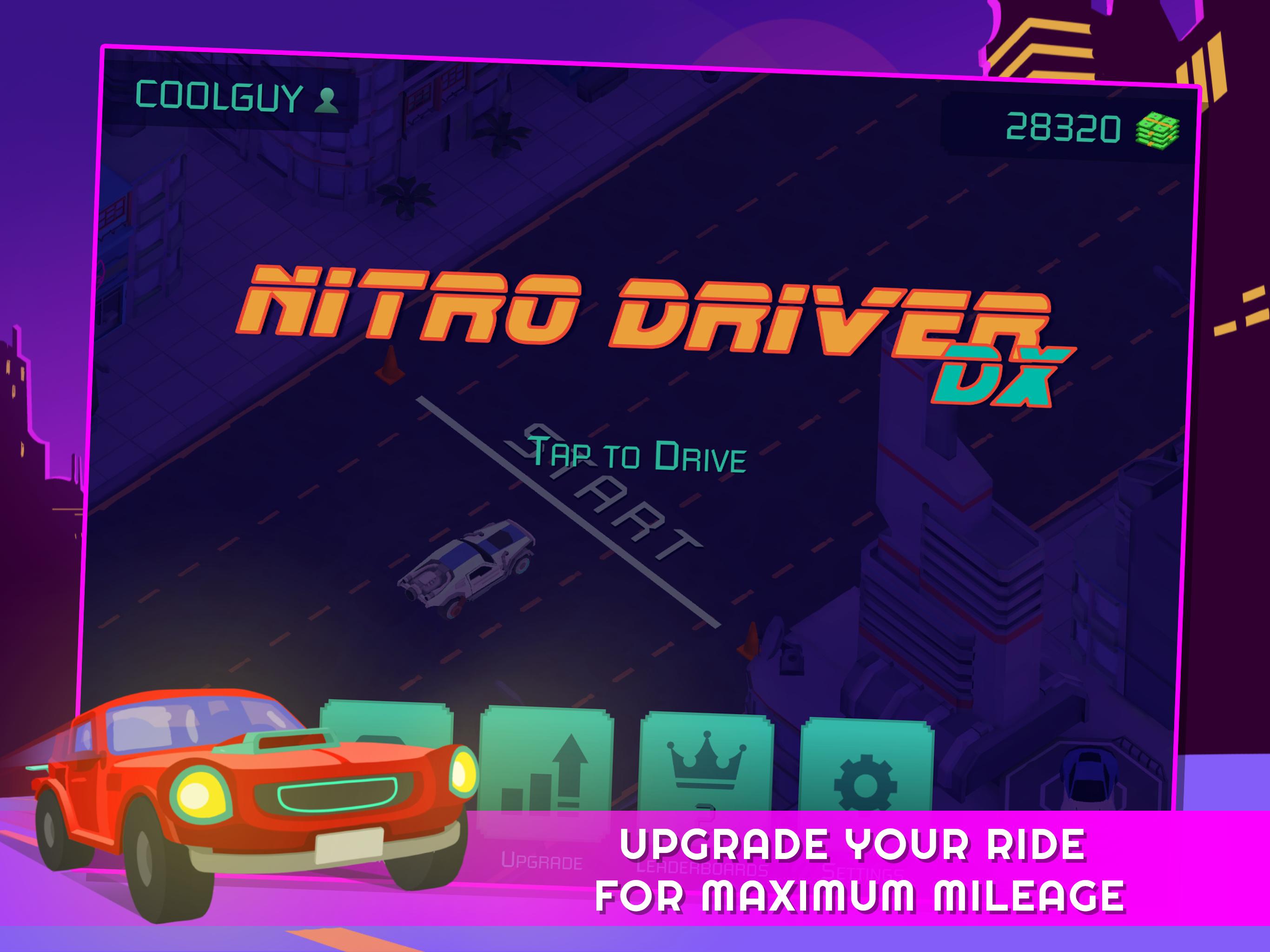 Get ready to push the pedal to the metal in Nitro Driver DX; a fast-paced driving game for speedsters! Swipe left and right to swerve the busy streets of Future City and collect cash. Use your riches to fill your garage with cooler and better rides; the more cars you own, the more cash you'll make. Upgrade your vehicles to increase their health and efficiency, then drift your way to the top of the leaderboard!
