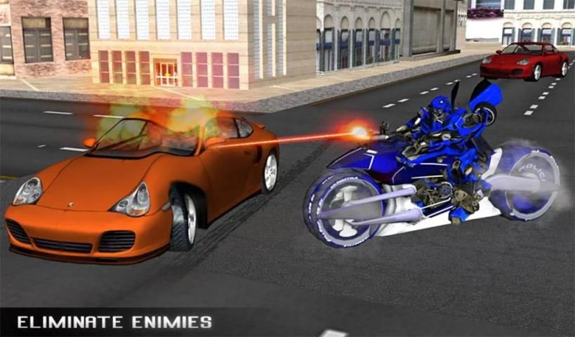 Are you interested in motorcycle games? Enjoy this newest concept of a magnificent mixture of motorbike with robot transformation game. Police Moto Robot Car Chase game has highlights of splendidly detailed simulation of bike into heroic robot. Drive smoothly your motorcycle but once you identify the threat start firing from your motorcycle, you can also convert instantaneously into a robot and start fighting to defeat your enemies. Police Moto Robot Car Chase is an amazing blend of robot moto bike riding, robot transformation into bike, criminal car chase and car destruction adventure. There is an epic police robot transformation into heavy police bike with super firing power that will destroy the criminals in car completely. You need to be the real hero of grand city and save civilians from chaos and destruction caused by the evil gang. Move your police moto bike on grand city roads showing some deadly stunts to chase the escaping criminal car. Don’t let the criminal car gang escape in front of you.
