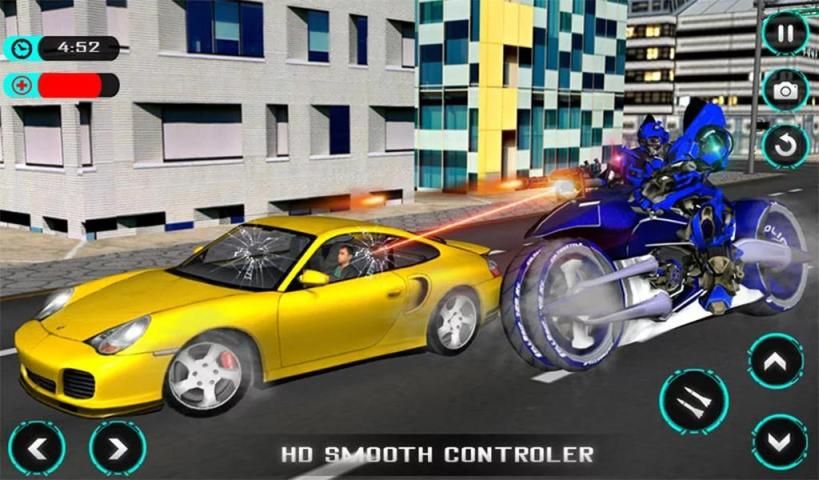 Rescue citizens from criminals with your police robotic skills. Its machine age, criminals has advanced, meet them with your best techniques. Be the extreme futuristic police robot moto bike stunt rider and chase the super car furiously, open rapid fire till the car gets completely destroyed and become the best police superhero of your grand city.