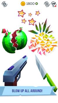 Follow the target, shoot at 3d objects, explode fruits breaking them to pieces with different weapons.