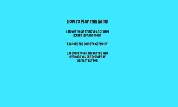 Save The Cat is a strategy game to collect point. Just save the cat from bomb by clicking the anchor of the screen right and left get point. But when the bomb get touch with cat it will die and game will over.