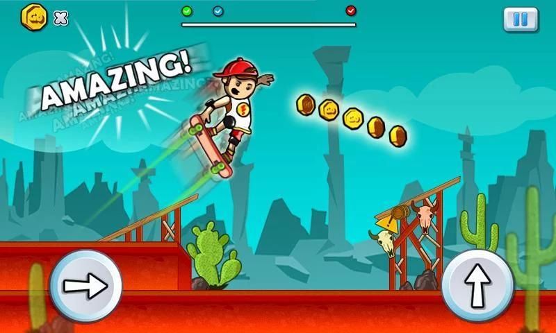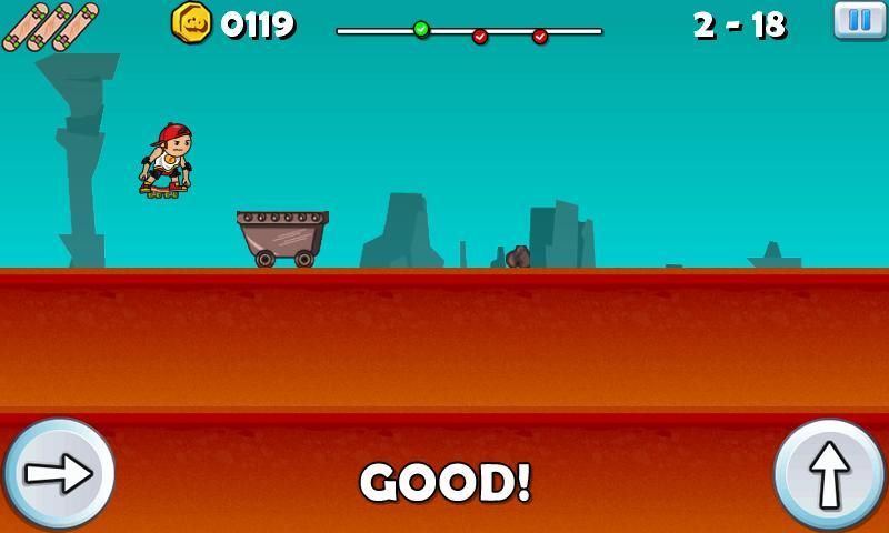 Go Pro in this amazing skating game! Grab your board and skate down 52 challenging levels. Tap to speed up and jump. Get as many coins as you can, and unlock more levels and new skaters. Feel the adrenaline of performing the craziest tricks during your rides. Get ready to have some of the most insane sessions in two different worlds.