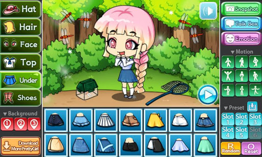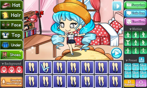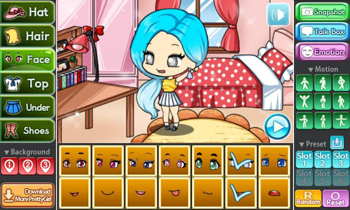 You can change the background, 9 poses and motions, you can also store your Pretty Girl in 6 slots.
