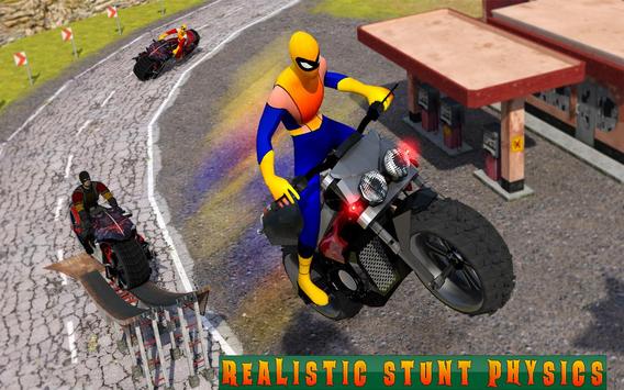 Perform high jumps and crazy aerial tricks in the stunt zone of incredible spiders superhuman where obstacles have been intentionally deployed. Test your extreme motor bike driving games skills in this greatest of extreme bike racing games. Dodge your opponents as a pro traffic racer and enjoy city highway driving on new 3D built tracks! This motorcycle simulator lets you have a pure pleasure of real racing experience. Perform professional crazy moto extreme stunts and boost your bike drifting expertise. Explore the thrill of realistic stunt bike racing while driving and feeling the thrill of real motorcycle simulator. Use ramps to jump and cross your opponents to earn extra points. Prove yourself as the best bike stunt games superhuman to show some crazy stunts during the race to beat your opponents.