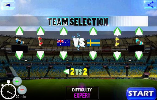 ✯✯Multiplayer: up to for 2 to 4 players on the same screen. select each team and the country represent. select 2vs2 or 4vs4 you can choose the color you want for each soccer player. Choose the playing time remember that in the middle of the game there will be a break so that the players do not kick the ball. the game will return in a few seconds.