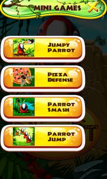 wakes him up in the morning. He owns a bathroom where he can take a bath and brush his teeth and prepare for a new day. You and the parrot will have so much fun together. Help your colorful bird to collect coins and to unlock every room. Play fantastic mini games and jump into the best adventure together. In Jumpy Parrot help him cross all platforms and try to achieve the maximum height. Open Pizza Defense and try to protect this delicious food from the attack of nasty insects such as spiders other bugs. Do not forget to keep safe butterflies and ladybugs because they will try to help you in your mission. In Parrot Smash just take a hammer and hit this birds as soon as you see them come out of the pit. Enjoy playing Parrot Jump, just tap the platform that you want your hero to jump. With this latest game, you will be able to take care of your favourite virtual pet.