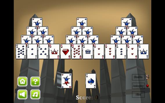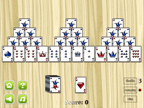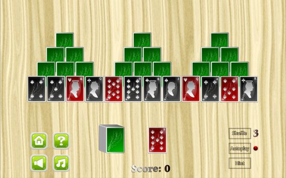 In this game, one deck of cards (without the Joker cards) are shuffled and arranged in three pyramid shapes. All cards on bottom of pyramid are placed face up, while the others are placed face down. The last card after forming the pyramid is called the top card and is placed face up below the pyramid shape. The remaining cards are placed left of top card, all in one stack and face down.