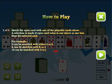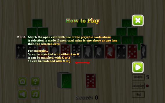 The objective of the game is to clear all the cards forming the pyramid shape by matching the open cards to the top card. A match can be made when the open card value is one less or one more than the top card. When a match happens, it can be moved to the bottom as a top card, and the existing top card is discarded. If none can be matched, the card from the stack can be moved as the top card.