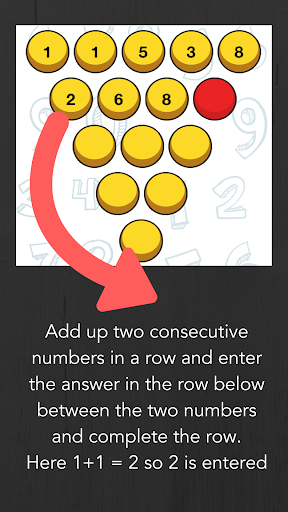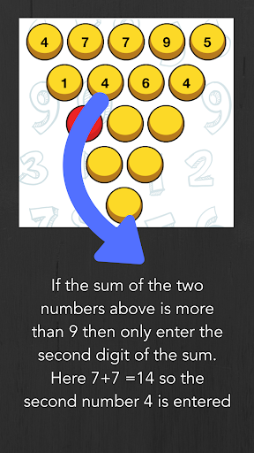 Tambahkan dua nombor bersebelahan di baris atas dan tulis jumlah mereka dalam baris seterusnya di bawah, di ruang antara mereka. Jika jumlahnya adalah nombor dua angka maka akan menulis hanya digit terakhir. Teruskan dengan cara ini & selesaikan baris. Kemudian pergi ke baris seterusnya