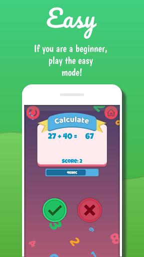 Jika anda seorang pemula, anda harus bermula dengan menggunakan mod "mudah"! Dalam mod ini, anda mendapat 60 saat, dan tugas matematik yang berbeza. Mula-mula anda mesti membuat keputusan sama ada penyelesaian tugas adalah benar atau palsu. Kemudian anda mesti menyelesaikan tugas-tugas matematik sebanyak yang anda boleh, sebelum masa sudah berakhir.