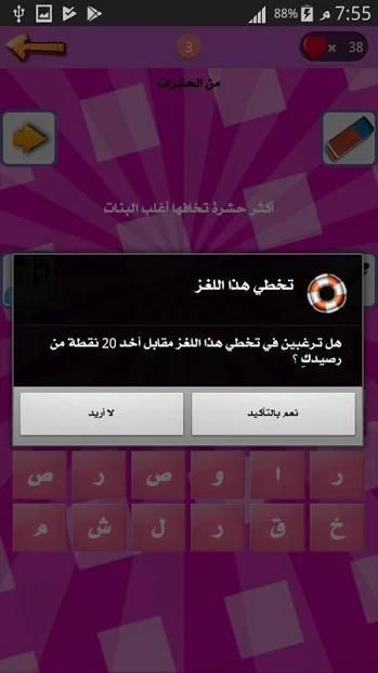 لعبة وصلة للبنات وبس خفيفة مسلية حلوه جميله رائعه و ممتعة جدا لكن تحتاج لبعض التركيز خصوصا في المستويات الصعبة التي من الممكن ان تصادفي فيها أسئلة صعبة عليك قد لن تجدي لها جواب وان حدث ذلك فلا تقلقي تستطيعين إستخدام وسائل المساعدة مقابل النقاط التي كسبتيها من حل الاسئلة السهلة الاولى وحتى ان كنت قد اكملت جميع النقاط فلا مشكلة تستطيعين كسب نقاط اخرى مجانا من خلال مشاركة التطبيق او تنفدي مهمات اخرى سهلة جدا جدا جدا