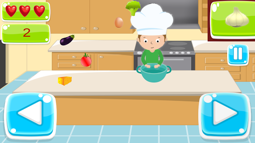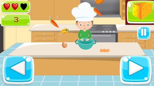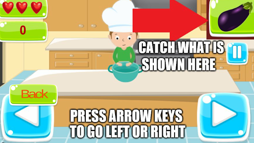 Join our junior master chef while he is cooking for top restaurants. Kitchen ingredients are falling from above. You have to collect them by moving the bowl with the arrow keys. The ingredient that is actually needed is shown in the target screen (upper right corner). Remember to only pick them. If you pick a wrong ingredient while cooking, you lose a life point. 3 mistakes like this while cooking and you lose your job.