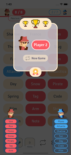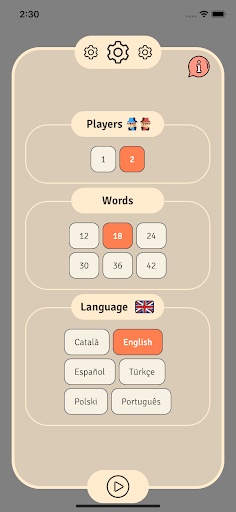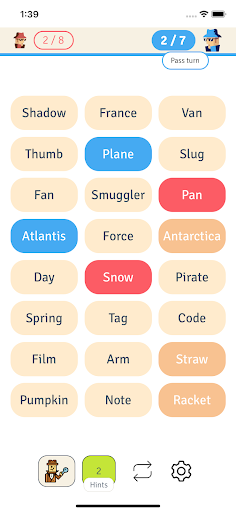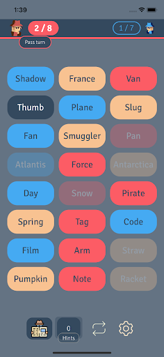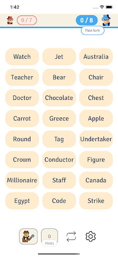 Pada permulaan permainan, akan ada 12, 18, 24, 30, 36 atau 42 kad (bergantung kepada pemilihan anda) di papan dengan kata-kata yang berbeza. Bar teratas menunjukkan pasukan mana yang memulakan permainan.