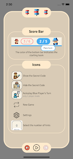 Ia adalah mungkin untuk bermain sama ada dalam satu mod pasukan, jadi anda akan memutuskan hanya pasukan merah Spymaster dan permainan akan autoplay team biru atau dalam dua mod pasukan, dalam kes ini anda perlu memilih pasukan Spymaster untuk Blue dan The Red Teams.