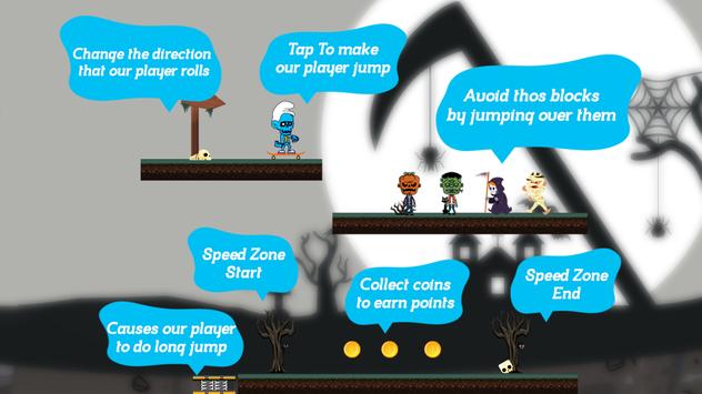 Zombie Smurfs Skater is easy to play just tap on screen to jump to avoid zombies.The pupose of the game is to help the Zombie Smurfs to escape from the zombie city.