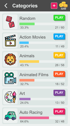 Rawak, Filem Tindakan, Haiwan, Filem Animasi, Seni, Perlumbaan Auto, Anugerah , Baseball, Bola Keranjang, Biologi, Burung, Tinju, Jenama, Bandar Capital, Selebriti, Kimia, Sukan Kolej, Muzik Negara, Kriket, Disney, Bumi, Makanan, Bola Sepak, Filem Asing, Golf, Hip Hop, Hoki, Mercu Tanda, Kesusasteraan, Filem (1990, 2000,2010), Muzik (1990, 2000, 2010), R & B Muzik, Mitologi, Lautan, Sukan Olimpik, Haiwan peliharaan, Memainkan & Muzikal, Puisi, Muzik Pop, TV Realiti, Muzik Rock, Sains, Sitcoms, Teknologi, Tenis, Perjalanan, TV (1990, 2000, 2010), Geografi AS, Sejarah AS, Permainan Video, Geografi Dunia, Sejarah Dunia.