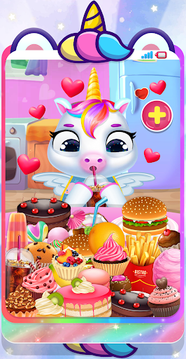 Binatang Unicorn Anda lapar, memberi makan Pony pelangi yang comel Sesetengah cupcakes, pastri, donat, jus, kek lazat, gula-gula, buah-buahan , dan sayur-sayuran.
