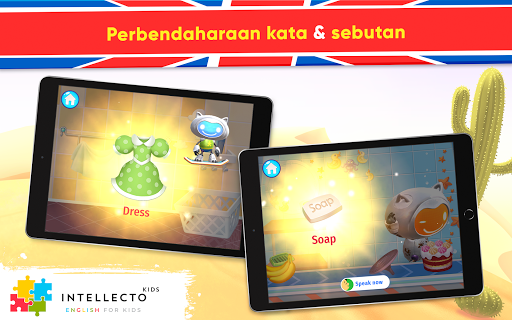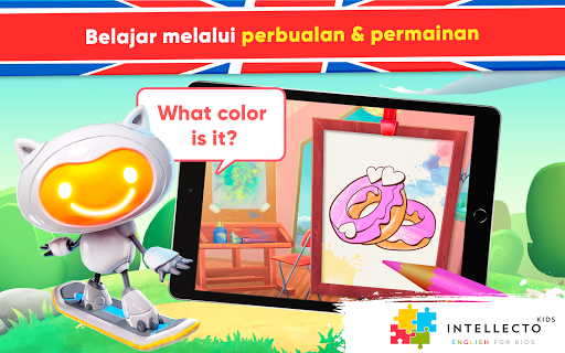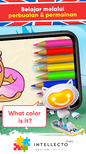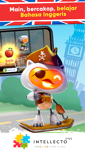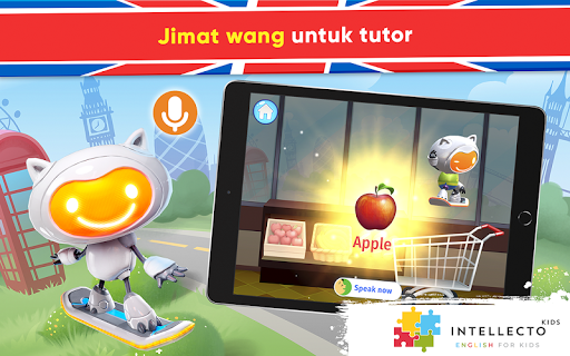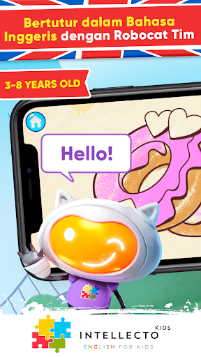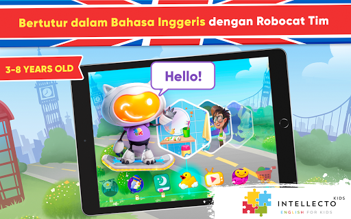 IntellectoKids Bahasa Inggeris untuk Kanak-kanak membantu kanak-kanak berumur 3-8 tahun MEMPELAJARI BAHASA INGGERIS dengan cara yang interaktif dan menyeronokkan! Seperti tutor sebenar, RoboCat Tim, watak AI yang comel, akan mengajar pertuturan Bahasa Inggeris kepada anak anda melalui perbualan situasi biasa dan permainan pendidikan mini.