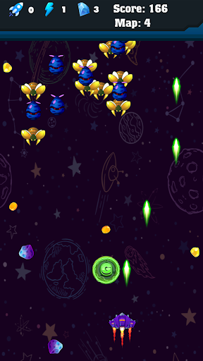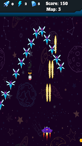 The game takes place in a deep space where alien forces are trying to destroy everything. Your job is to fight them with your space plane and win the galaxy air combat. You will fly your fighter plane in the galaxy and waves of alien ships will come in your way to destroy you. they will shoot, bomb, and perform suicide attacks to destroy your spacecraft. You'd have to dodge, shoot, and throw bombs and missiles at them and kill them all. You can collect gems and gold along the way and upgrade your plane and weapons using those. When you are in the galaxy air combat fighting evil alien ships, you'll constantly have boosters to power up your shooting strength. Don't miss them when they come to boost your firepower!