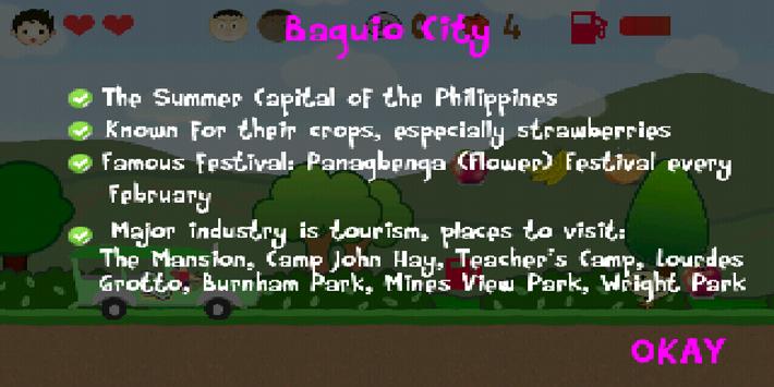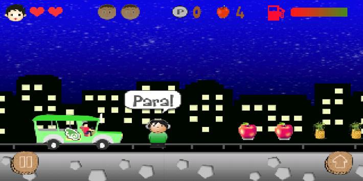There will be a total of nine stages with three levels each (morning, afternoon, evening). Three stages will be divided in each major island of the Philippines (Luzon, Visayas, Mindanao). The last stage will be the place where the player will finally meet the girl. The game will have twists in some parts to spice up the gameplay. Each level, the player has a target number of passengers that he will deliver to their destination and this number will increase as the player goes on the next stages. The player can only help the passenger reach their destination if he can answer the passenger’s question, which is about their desired destination.