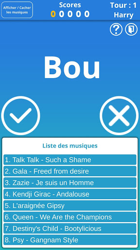 Setiap lawatan anda harus memilih muzik dari senarai rawak, kemudian Cuba untuk mendapatkannya dengan menggunakan hanya suku kata (contohnya tic-pouf).