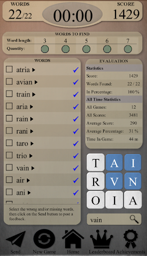 - Anda boleh menghantar maklum balas: Walaupun kami selalu berusaha melakukan yang terbaik, tentu saja, kami tidak sempurna. Anda boleh menghantar maklum balas kepada kami mengenai kamus dengan mudah di skrin maklum balas kami. Sekiranya anda menemui perkataan yang salah atau tidak ada, hantarkan kepada kami. Dengan cara ini anda dapat membantu kami menjadikan permainan lebih baik dan lebih baik.