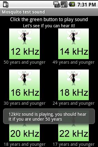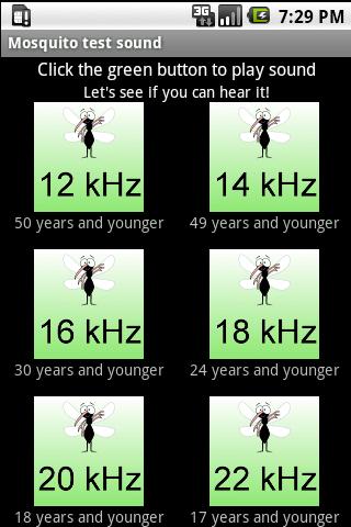 Mosquito test sound application test if you can hear high frequecy sounds according to your age.