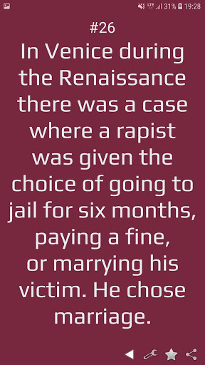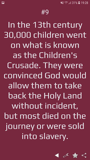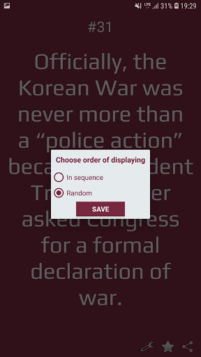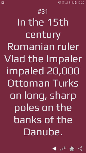 Impress your friends and family with your knowledge about historical facts. Application contains 500 historical facts about ancient empires (Rome, Egypt, Greece,China, Japan), medieval ages, Napoleon wars, US Revolution, Industry Revolution, Civil War, Great War, World War 2, Korean War, Vietnam War and more. Application allows you to choose order of displaying facts (random or by sequence).