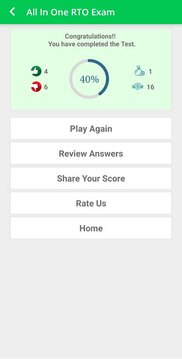 ➠ Exactly same as RTO test, random questions and road signs related questions will be asked in this exam.Time limits are useful to sharp your mind and prepare for the exact RTO test. All done question is done then after your result will be displayed on the screen and also you can see your complete scorecard by click on View Scorecard button.