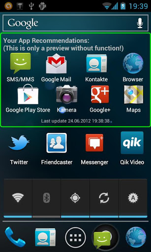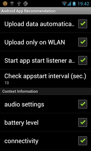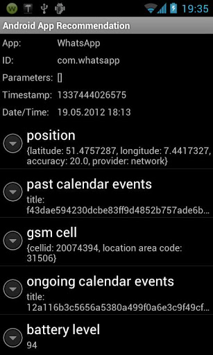 Please start the app once after installation and updateAndroid App Recommendation is a research project as a part of a dissertationdoctoral project. The objective is to use contextaware recommender systems to recommend apps on an Android device, that are of interest for the user in the current situation. In the ideal case, the app recommends a small number of apps e.g. eight apps via a widget that shows the one app the user wants to start. The user does not need to search for an app from the list of all apps, but receives a contextsensitive selection of apps on the home screen.In addition, apps that other users use in the same situation should be recommended. Thus, the user should be advised to apps that may be of interest to him.The Objectives in a Nutshell: to predict, which app you want to start just now to recommend you an app that other android users use in your current situationquot;I39;ve got over a hundred apps on my phone. For the most important apps, I have a link on the home screen. Other apps I need to search for in the list. Sometimes, I even do not want to start a rarely used app, due to the annoying search. Imagine, the home screen always shows a link to the app that you just want to use Searching would have an endquot;The question is, whether and how the apps the user wants to launch can be inferred from the context information For this, real life data must be recorded and analyzed. That is the purpose of this project.For the development of the algorithms, we need realistic data. For this, we need users that install the Android app and help us to get data. Please install the Android app and help with the research project All you have to do is to install the Android App Recommendation app on your Android device.Do you have suggestions for improvements? Comments? Is there anything not understandable? Are you looking for contacts in the field of data mining or recommender systems? Please write me an email to myfeedback@apprecommendation.org Thank youFor what does the app need the permission XYZ?FINE GPS LOCATION For context information positionFULL INTERNET ACCESS To upload the dataREAD calendar EVENTS PLUS CONFIDENTIAL INFORMATION For context information past, ongoing and upcoming calendar events.READ BROWSER39;S HISTORY AND bookmarks There are first attempts to register not only apps but also the sites you visit. These are not saved yet. If this happens, you will clearly be noted.READ CONTACT DATA Is needed for last calls.RETRIEVE RUNNING APPS To detect when an app was started.VIEW NETWORKWIFI STATE Context informationMore information at http:www.apprecommendation.org