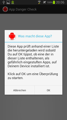 Diese APP ist in einer Zusammenarbeit mit dem Magazin android User.de entstanden und soll Euch eine kleine Hilfe sowie ein kleines Stück mehr Sicherheit anbieten.Basis des ganzen ist ein Artikel der im Print Magazin Android-User.de unter meiner Mitwirkung entstanden ist und apps ins Visir nimmt, die mit nahezu krimineler Energie den Play-Store und andere App Stores überschwemmen. Klares und einziges Ziel dabei, BernutzerInnen mit Werbeeinblendungen und PushWerbung zu überschütten. Die meisten der direkt in diesem Artikel angeführten Apps sind bereits aus dem google Store entfernt worden, jedoch leben diese Apps in sekundären Appstores weiter undverbreiten sich ungewollt schnell auf unseren Smartphones.Um Euch eine gewisse Sicherheit zumindest gegen die zur Zeit entdeckten, schädlichen Apps zu bieten, wurde die Idee zu dieser App geboren. Im Grunde eine einfache Sache, von einer vertrauenswürdigen Seite wird eine Liste mit App-Packagenamen geladen und das Smartphone wird danach dahingehend überprüft ob eine der in dieser Liste angeführten Apps installiert ist. Nicht mehr und nicht weniger. Ihr könnt selber entscheiden, ob ihr die App dann deinstallieren wollt oder nicht. Die Berechtigungen: Internet: Benötigt um die Liste der bekannten Packages herunter zu laden.Access_Network_State: Notwendig um eine funktionierende Internetverbindung abzufragen.Link zum Artikel bei Android-User.de:http://www.android-user.de/Magazin/Archiv/2013/04/Die-fiesen-tricks der-Anzeigen-Mafia-bei-Google-PlayLink zur Entstehung dieser App:https://android-security peggy-forum.com/2013/03/von-appzockern-und-guter-zusammenarbeit/Mein Dank richtet sich an Marcel Hilzinger vom Magazin Android-User sowie an den Forensic Experten Marko Rogge. Erst diese fruchtbare Zusammenarbeit ermöglichte diese App!